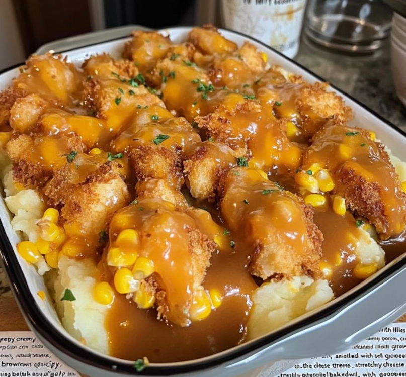 Remove from oven and drizzle warm brown gravy over the casserole.